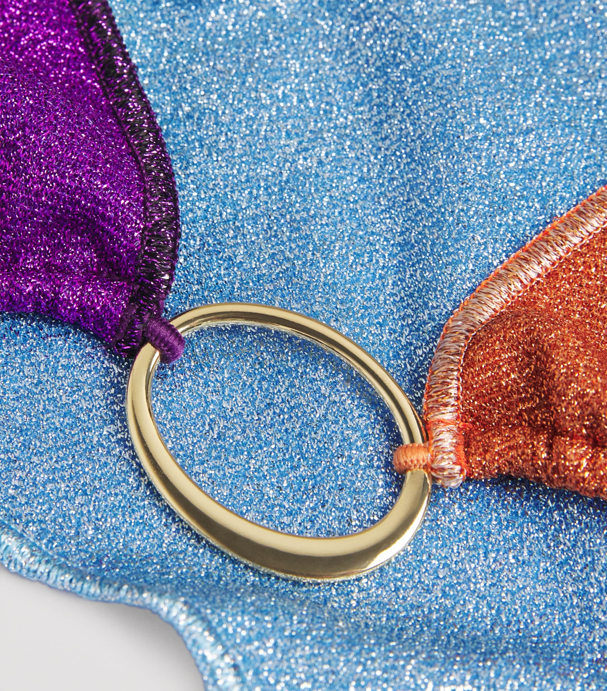 Oséree reimagines its signature silhouettes through the lens of luminous texture in the Glazed Lumière O-Kini bikini. Cut from a second-skin fabric that glows with multicolour reflections, the set blends athletic precision with a touch of high-gloss glamour. The top is anchored by the brand’s hallmark metal ‘O’ ring — a motif echoed at the hips of the coordinating bottoms.