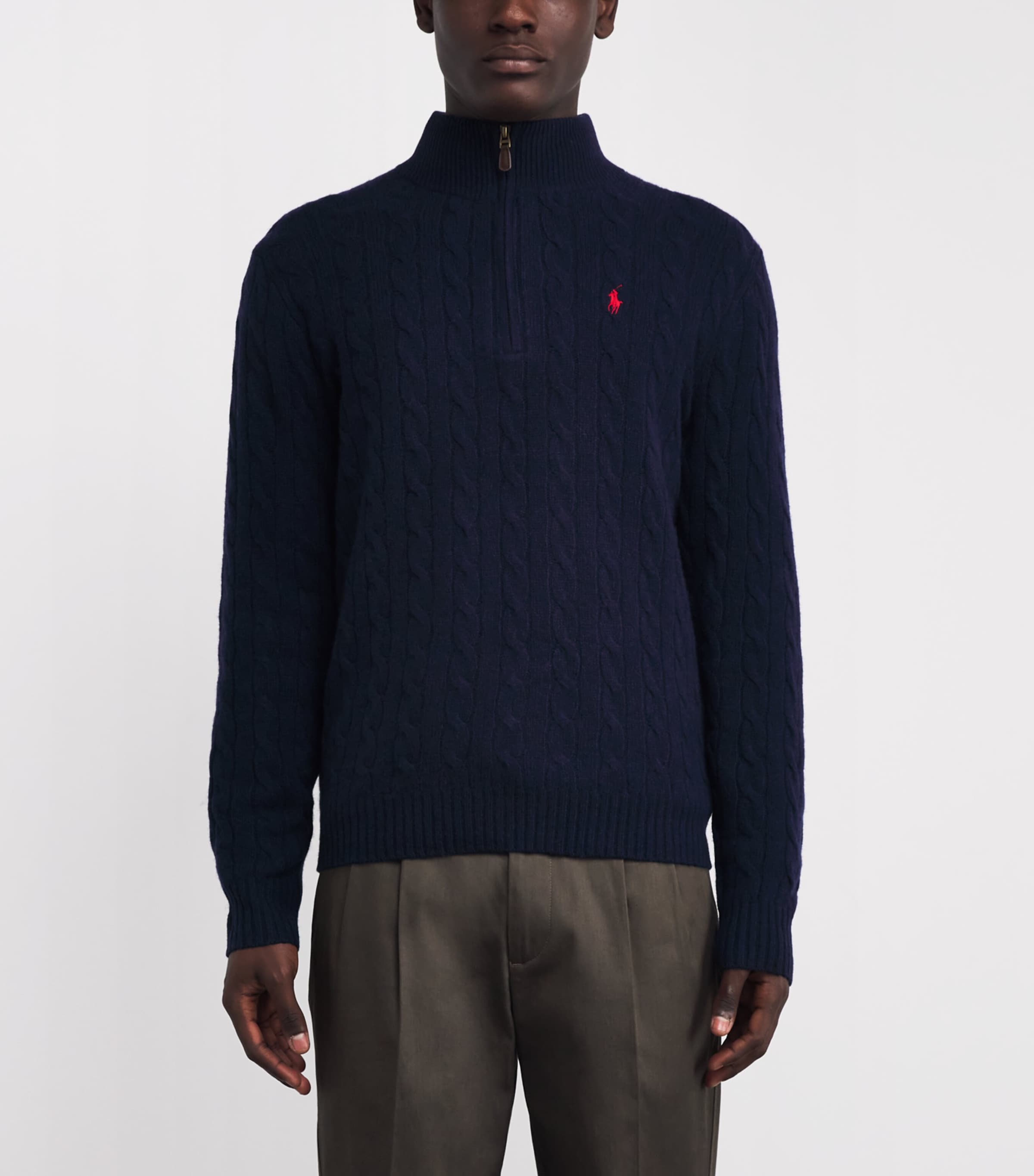 Polo Ralph Lauren Blue Wool-Cashmere Cable-Knit Quarter-Zip Sweater