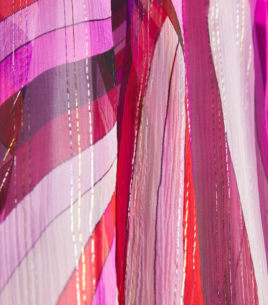 Forming part of Pucci Junior's latest collection, this elegant dress is awash with the vibrant Iride print in rich shades of pink, red and purple. Crafted from sheer chiffon and woven with silver- and gold-tone threads, the flowing silhouette is finished with a satin lining for all-day comfort.