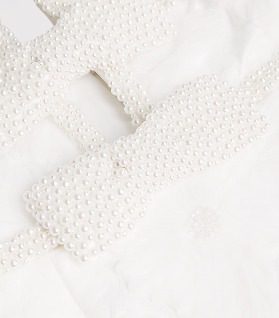 Pearly bows gift wrap this sophisticated A-line silhouette.