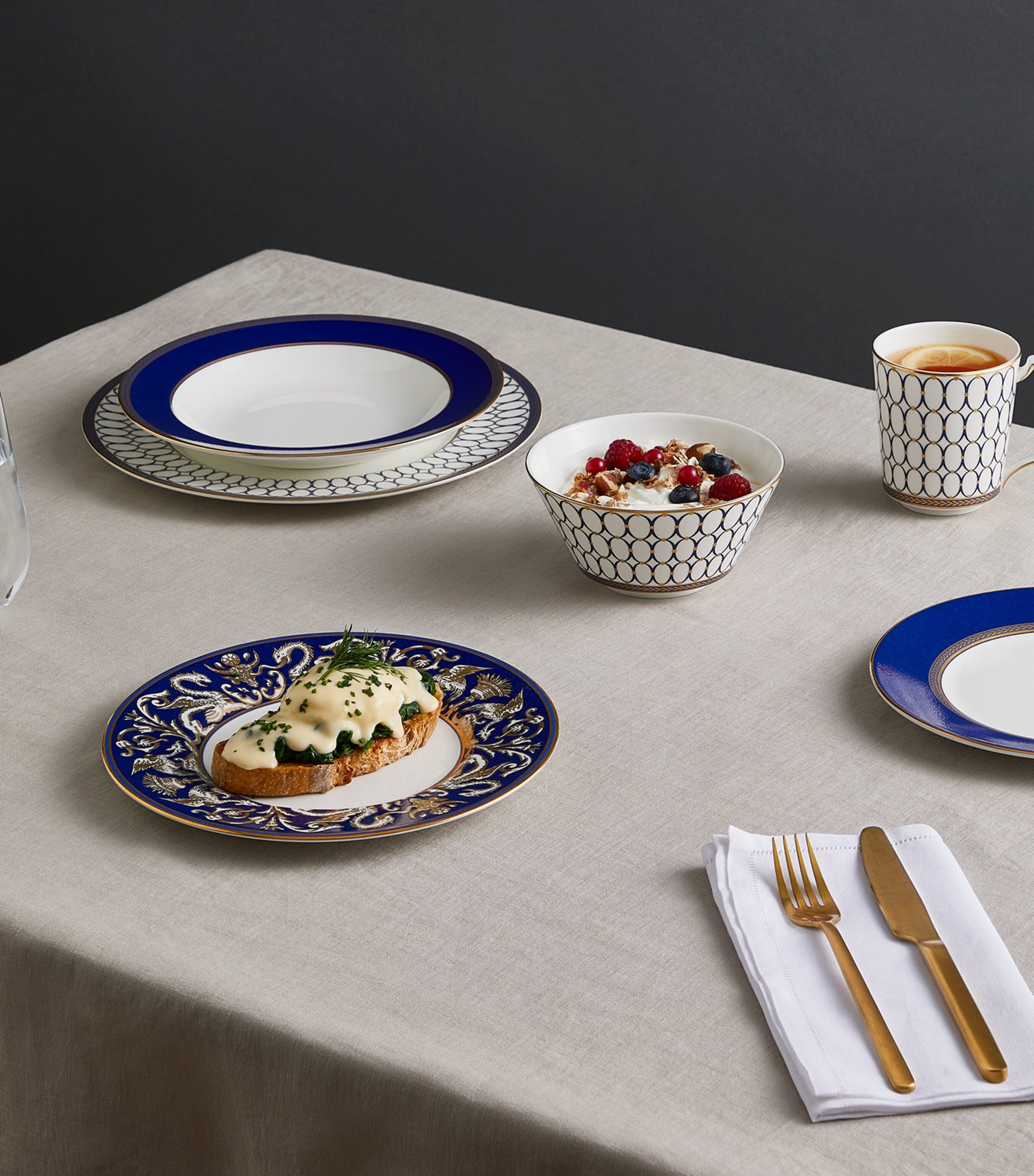 Lustrous golden detailing infuses ornate beauty into your tablescape.