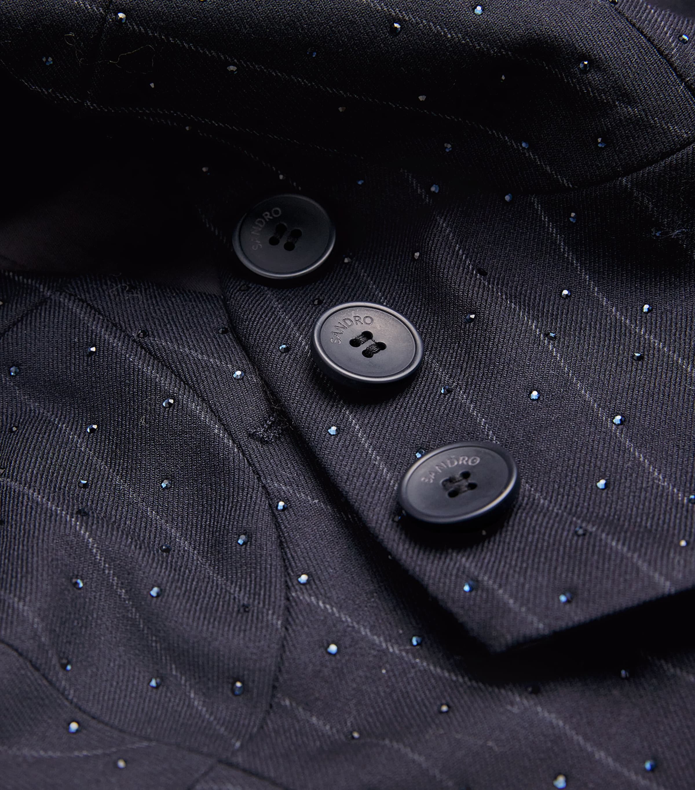 Creating its signature masculine-feminine equation that challenges gender norms, Sandro often takes cues from classic menswear and reimagines it with elegant flair. This stripe waistcoat, for instance, sees the traditional V-neck, button-down silhouette revived in a cropped fit and dazzling rhinestone embellishment.