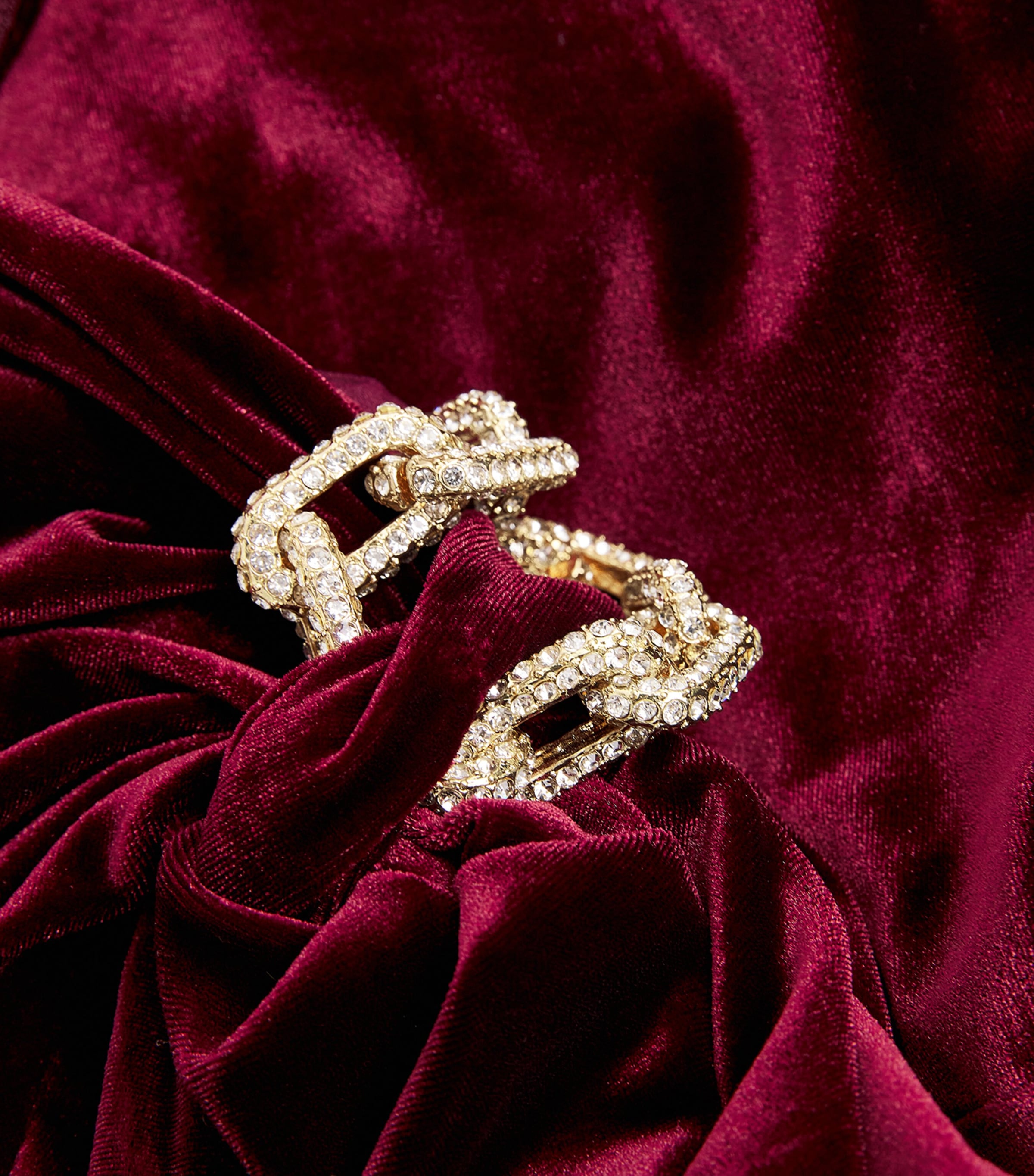 The perfect plus one to your next engagement. Presented in luxe velvet, this maxi dress from Self-Portrait is guaranteed to make heads turn at your next engagement. Kept perfectly simple save for two embellished chains at the left hip, this piece does all the talking – always speaking the language of style, of course.