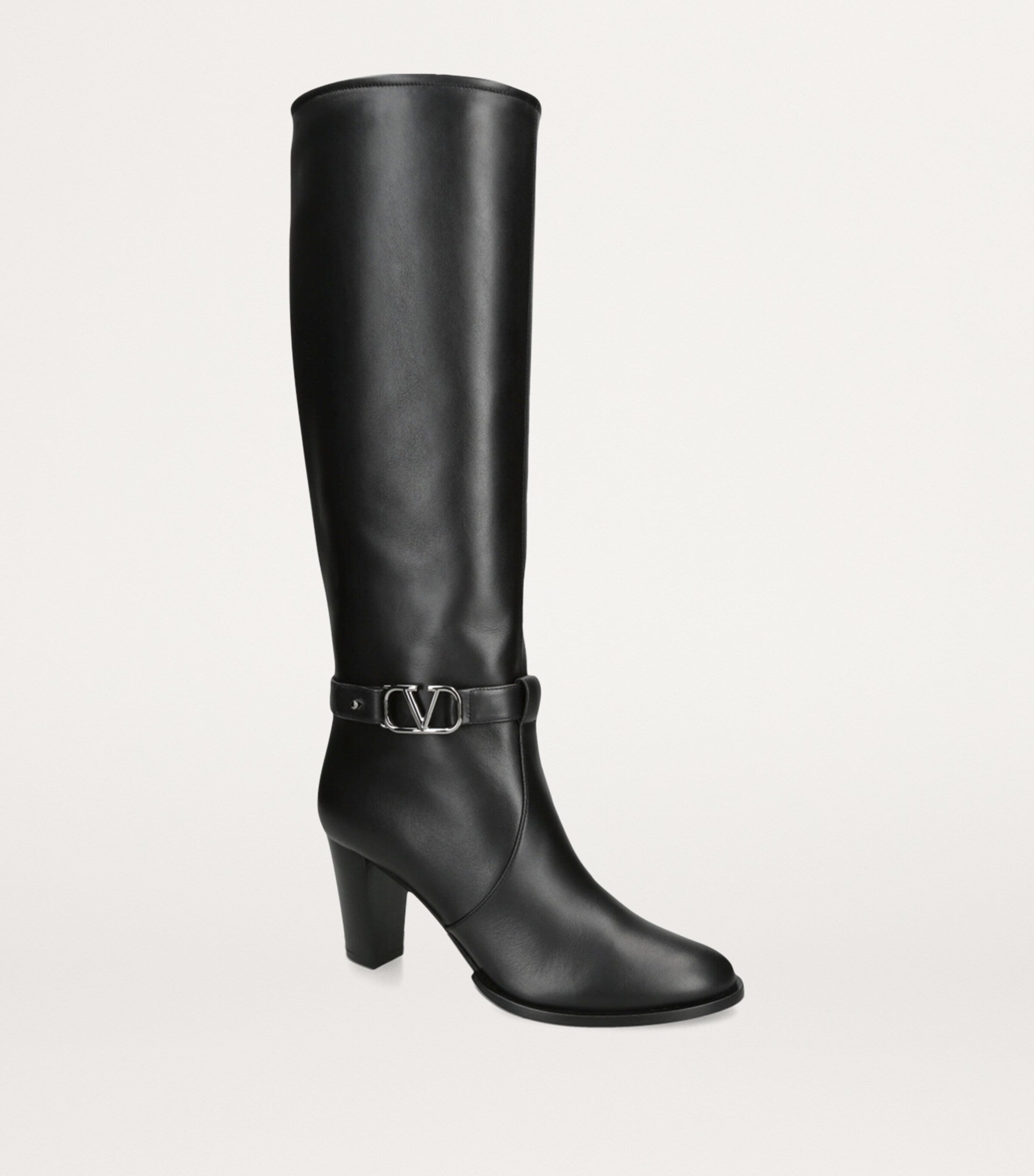 A logo that’s synonymous with refinement, Valentino Garavani’s metallic VLogo is the label’s stamp of luxury on many of its elegant ready-to-wear. Here it accents the sleek exterior of these knee-high boots, adding a polished note to the smooth leather silhouette.