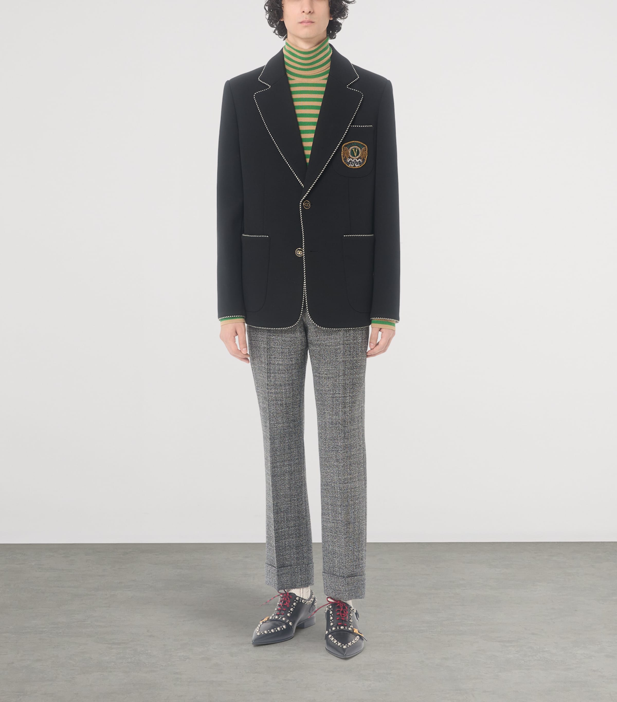 Throughout Alessandro Michele's work for Valentino, the designer has drawn on the timeless appeal of on-campus style, introducing a preppy touch to everything from the House's silhouettes to its storied motifs. Here, for example, the House utilises pure virgin wool to tailor a uniform-esque blazer, complete with an intricately embellished crest at the pocket and signature VLogo buttons.
