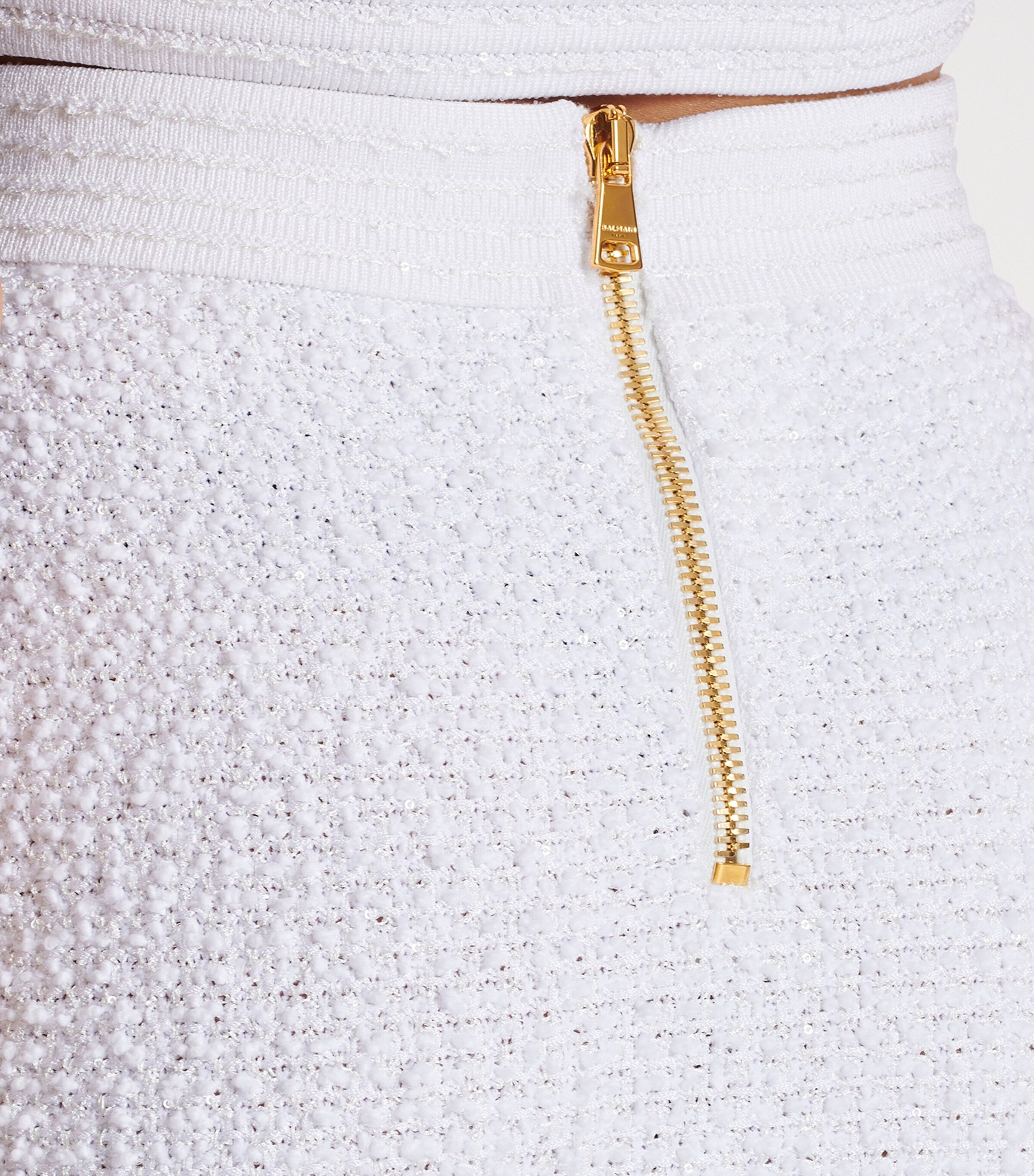 Two classic Balmain elements come together harmoniously in this mini skirt: tweed and metallic buttons. The plush fabric nods to the Maison’s love for vintage textiles, while the decorative gold-tone embellishments, which take inspiration from medallions, add high-octane energy to the design.