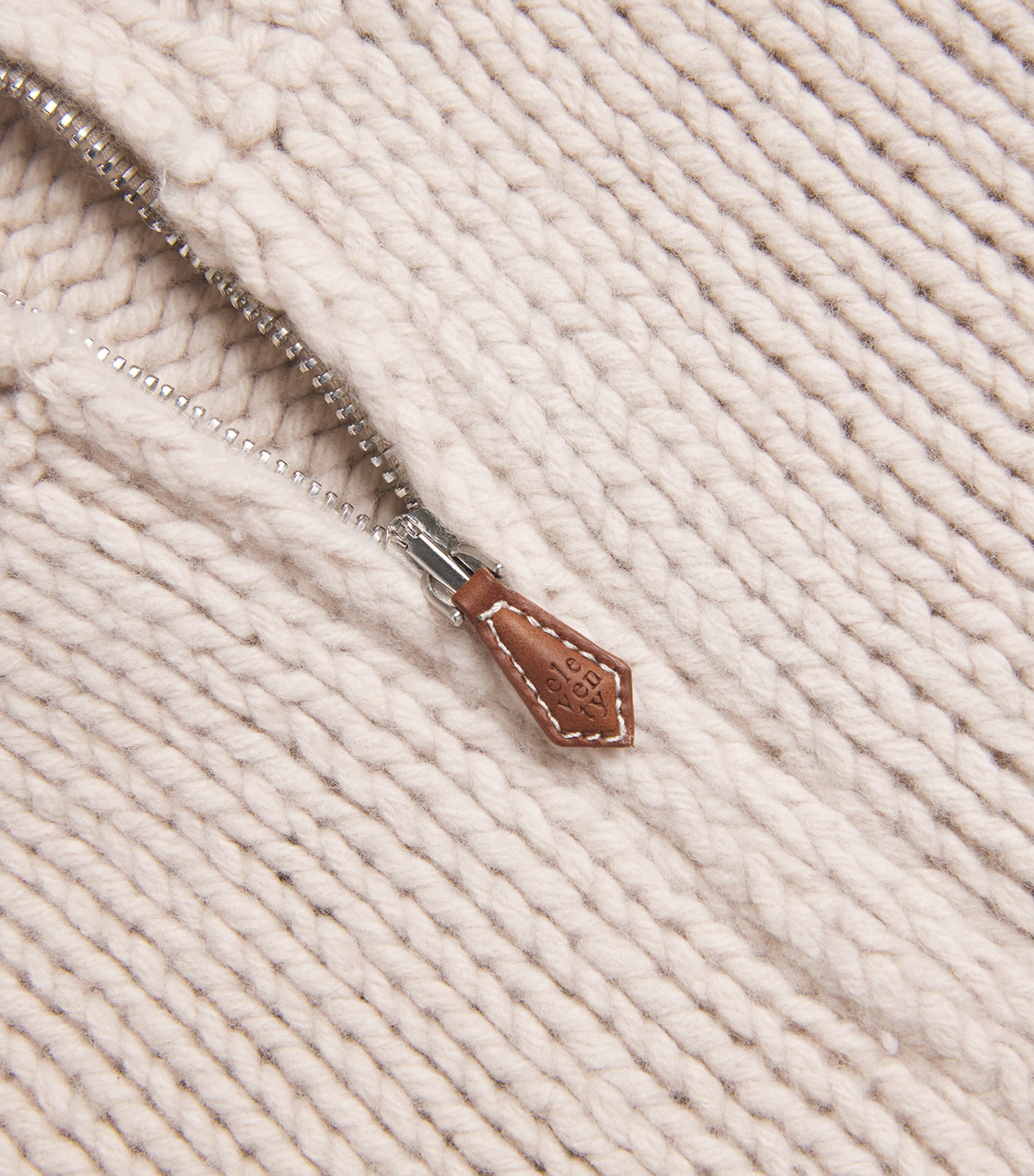 Crafted from a generous, hand-finished wool yarn, this sweater offers a robust yet beautifully soft texture, designed for superior warmth and tactile pleasure. The quarter-zip opening is discreetly secured with a sleek, polished zipper and finished with a refined calfskin leather pull tab for a rustic flourish.
