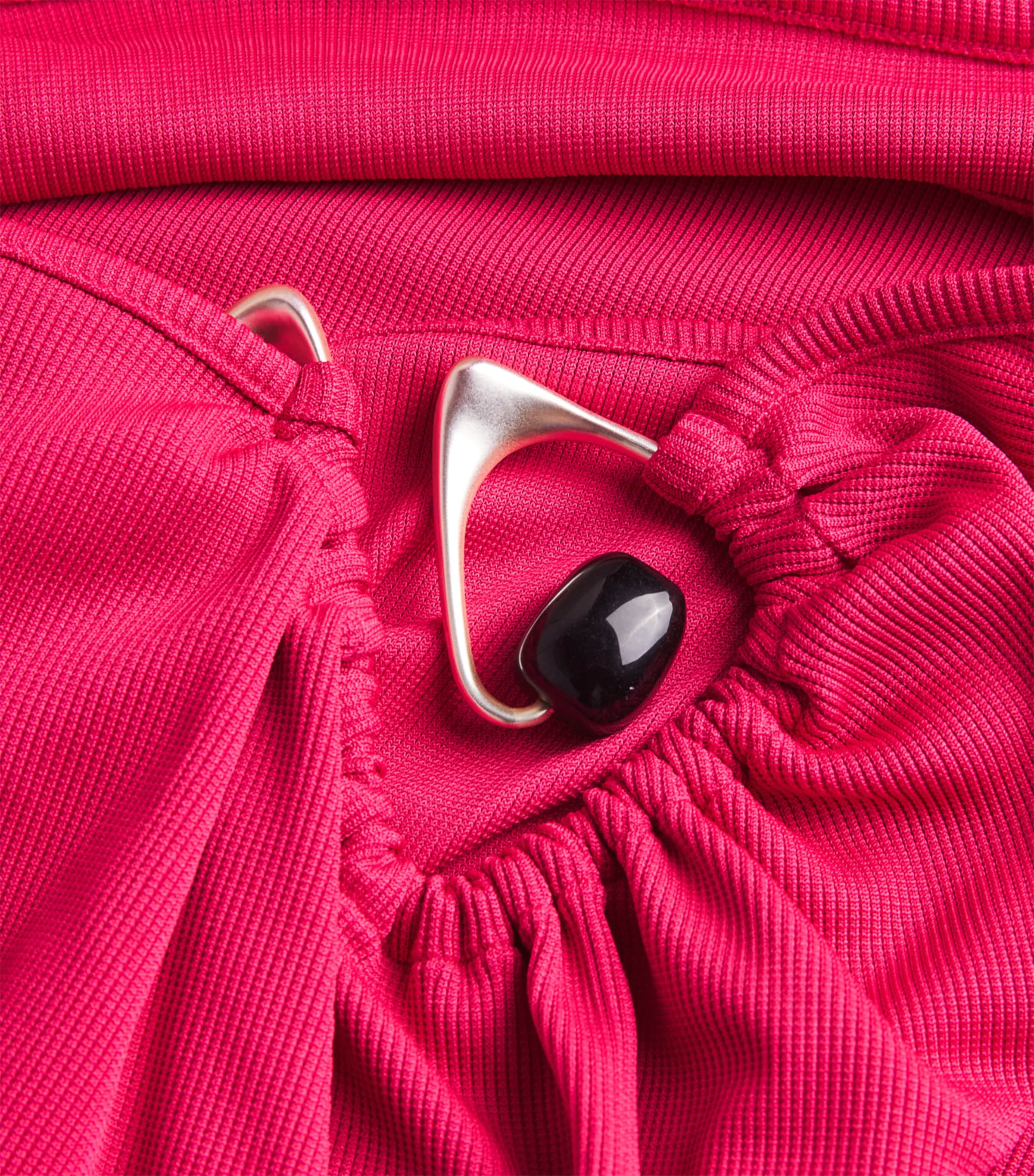 An immediately recognisable design from one of Australia's premier labels. The use of stones and gems is a Christopher Esber signature, and for this stretchy, fitted maxi skirt, it immediately places this detail centre stage. Balanced on a sculptural spiral wire at the centre of a dramatic cut-out over the waistline are unique stones that create a graphic parallel to the ribbed, cranberry-hued silhouette.