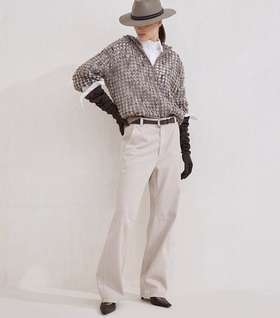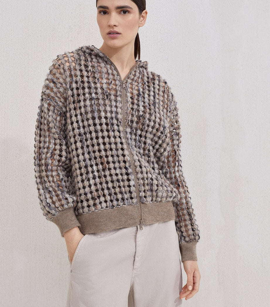 A versatile staple elevated by artisanal craftsmanship. Fusing comfort with craftsmanship, this Italian-made Brunello Cucinelli hoodie showcases elegant net embroidery and softly exaggerated balloon sleeves. The hooded silhouette is anchored by a two-way zip and relaxed shoulder line, offering a sophisticated interpretation of a sporty classic.
