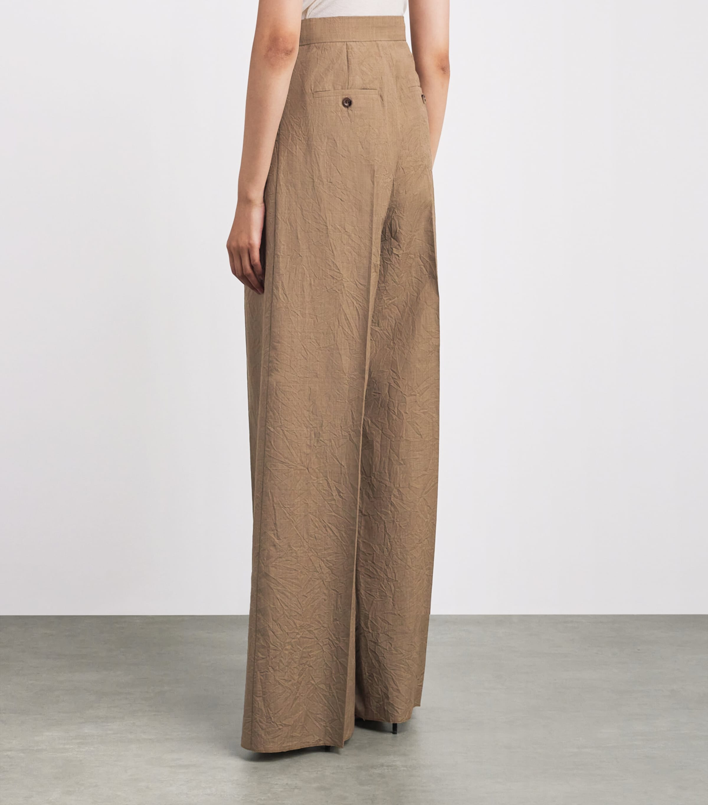 Max Mara reimagines tailored staples through a tactile lens with these virgin wool trousers, cut in a fluid silhouette and finished with a shimmering, crinkled surface. The soft sheen and sculptural creases create movement with every step, offering an artful twist on classic dressing.