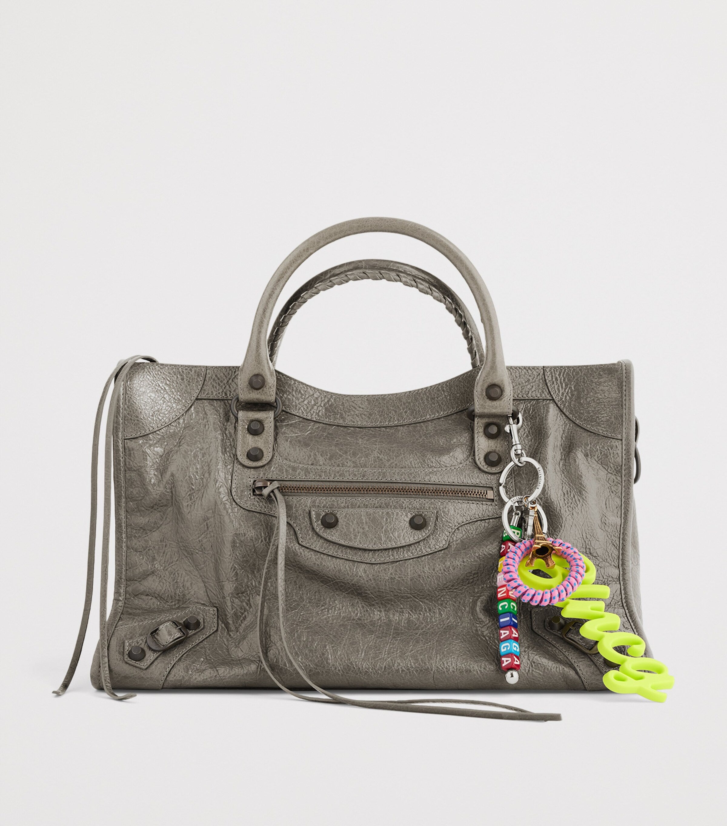 When it comes to its graphic identity, Balenciaga is fearless, adopting the streetwear approach of endless reinvention, with surrealist parodies of everyday logos a common occurrence. Here, for example, the brand plays on the classic silicone name keyrings that frequent souvenir stores, presenting an engraved keying with a Blncg charm.