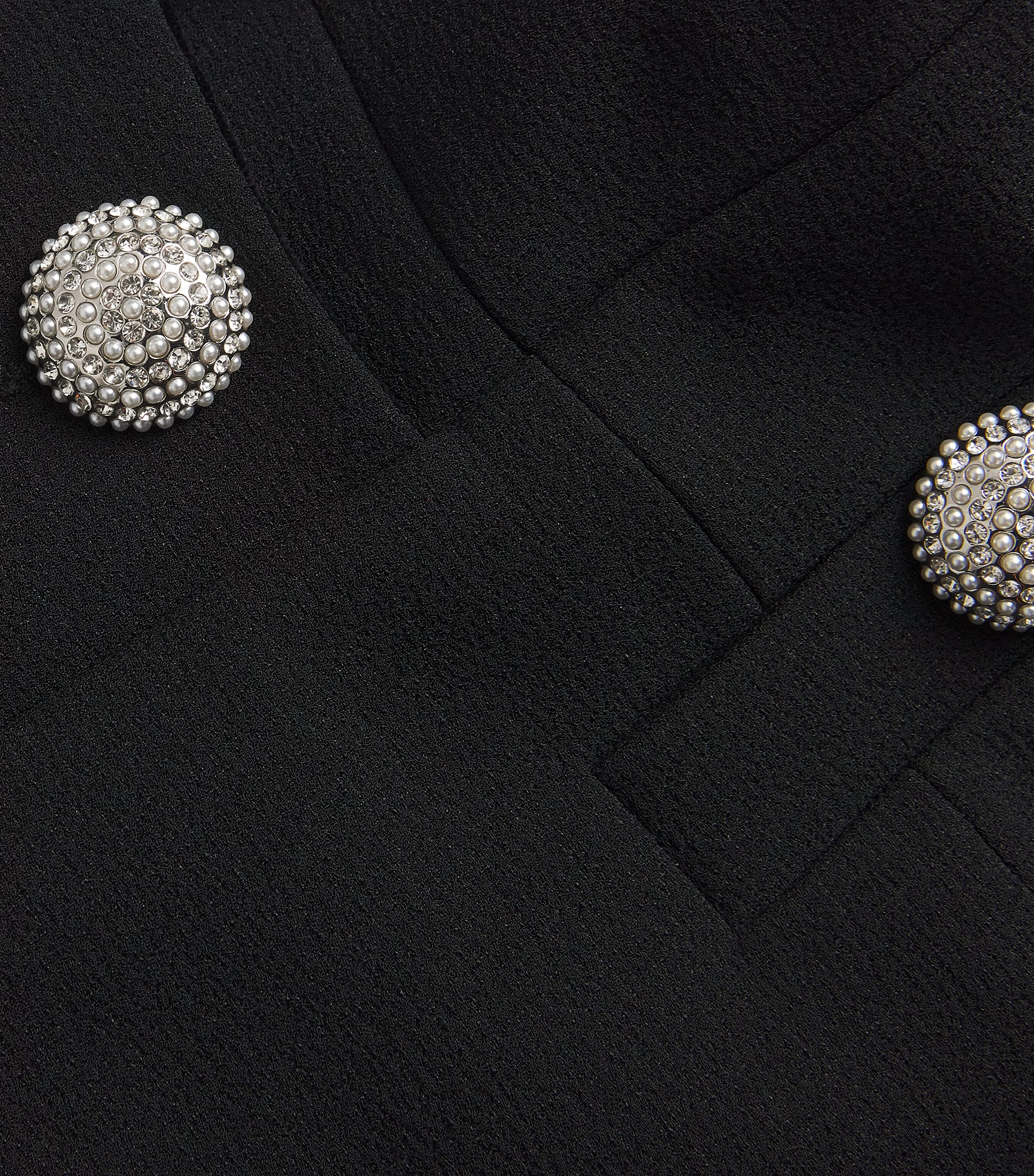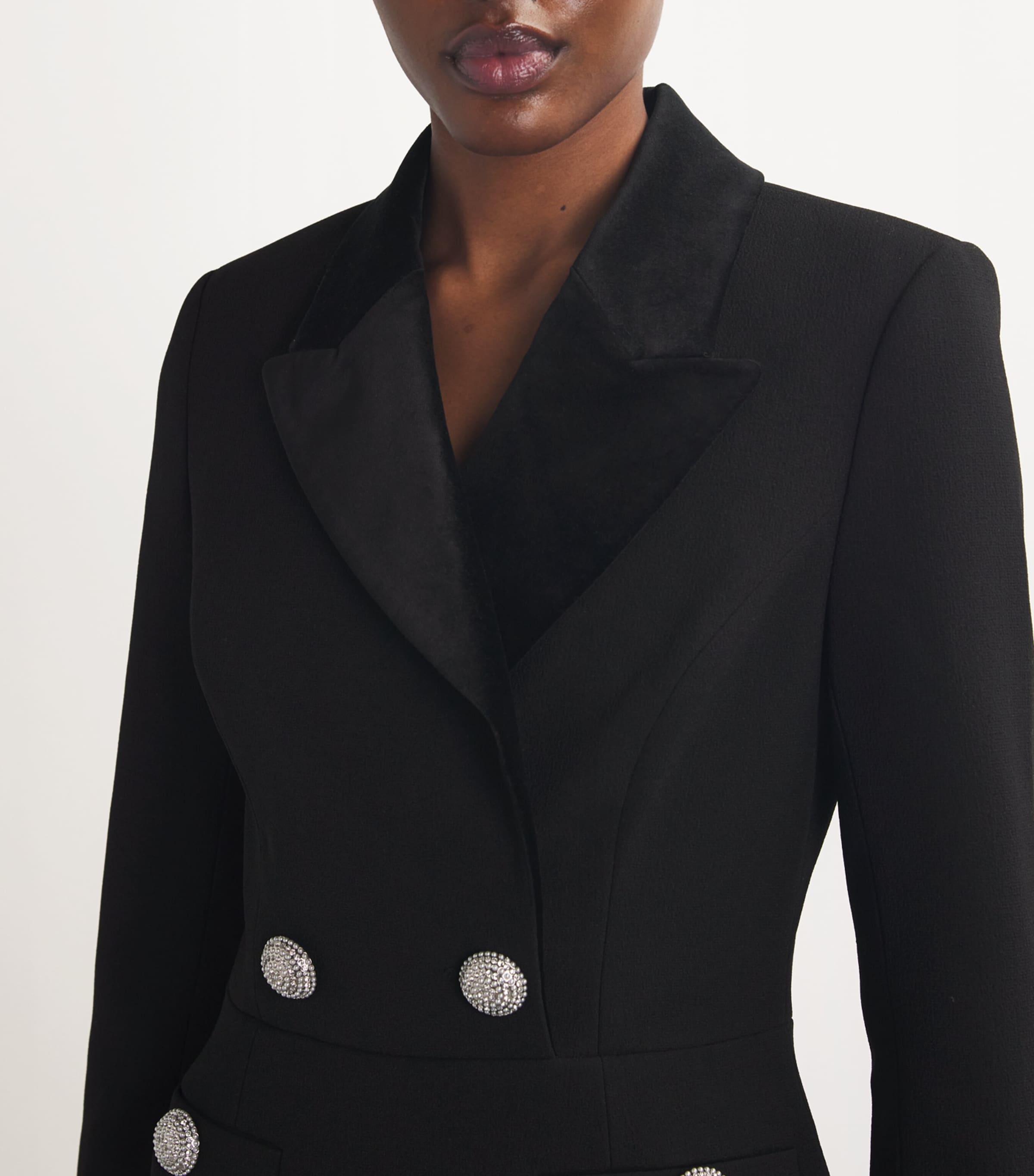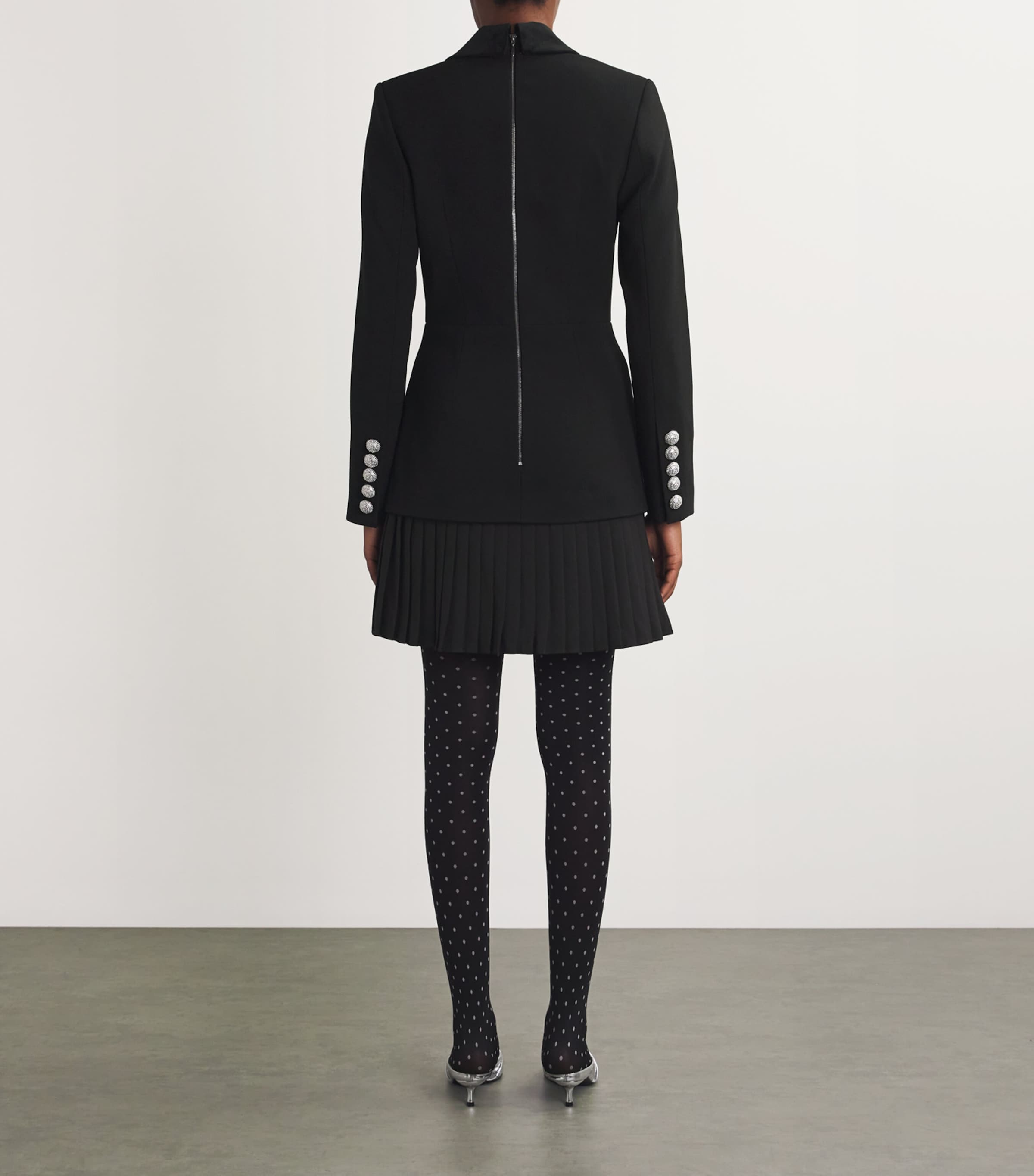 Born out of friendship, Rebecca Vallance’s Holiday 2024 capsule collection – created in collaboration with American designer, businesswoman and philanthropist Nicky Hilton – presents the ultimate line-up of elegant partywear. Eternally sophisticated, the Celia mini dress takes inspiration from the classic tux with its padded shoulders, peak lapels and button detailing, while a pleated underlay skirt lends a feminine finish. Complement your jewellery with the silver-tone buttons.