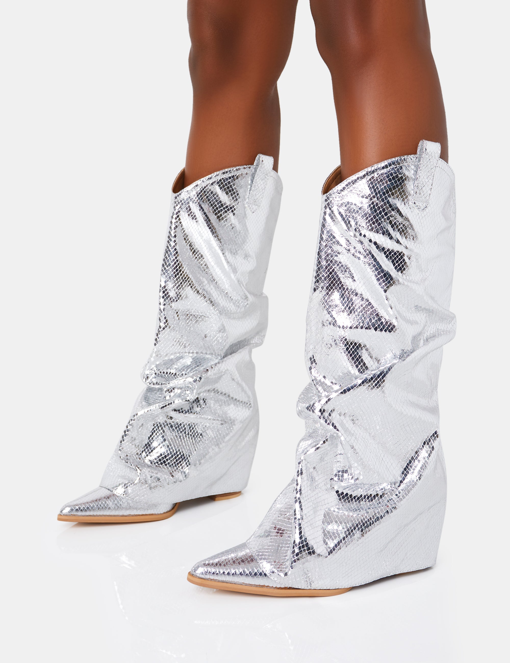 Sheriff Silver Metallic Western Fold Over Block Cowboy Knee High Boots - UK 3 / EU 36 / US 5