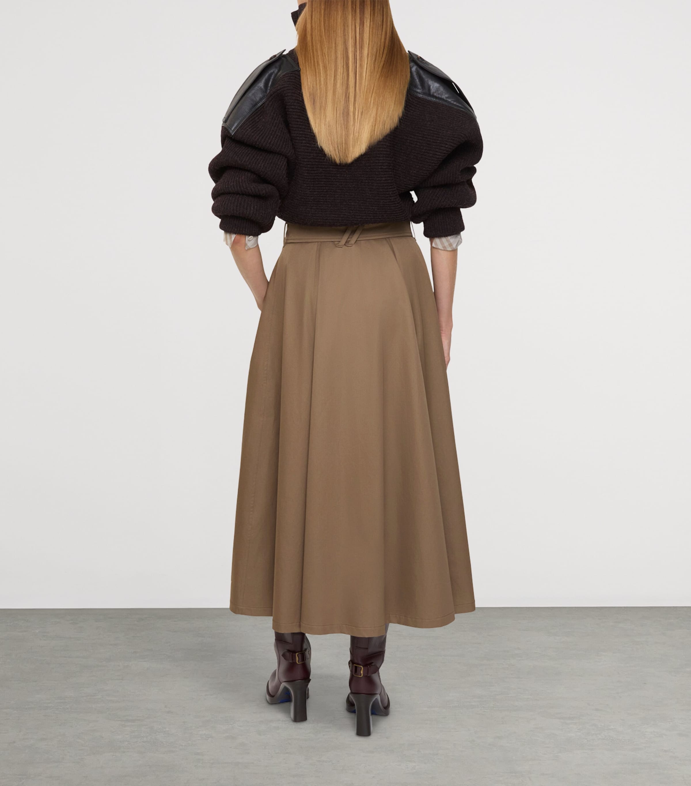 Only Burberry could transform its signature trench coat into an entirely new silhouette, yet effortlessly preserve the heritage allure of the original. This cotton gabardine midi skirt does just that here, detailed with a double-breasted fastening at the waist and an authentic belted feature.