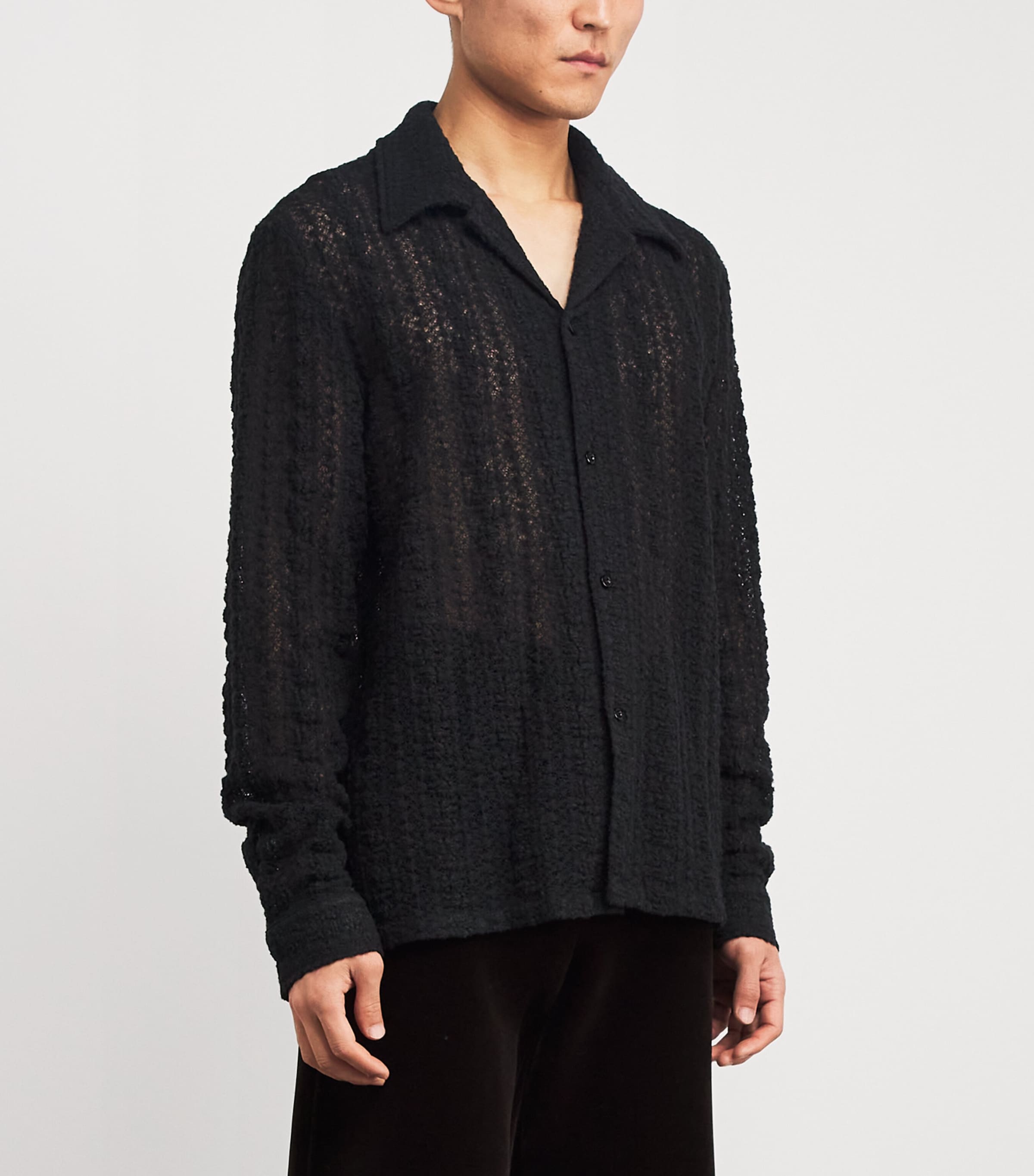 The Jagou shirt by Séfr is crafted from a delicate wool-blend lace that is irresistibly translucent, offering a light layer with subtle texture. Its soft, airy fabric drapes gracefully while providing a modern twist on classic tailoring, making it perfect for layering or wearing alone as a statement piece.