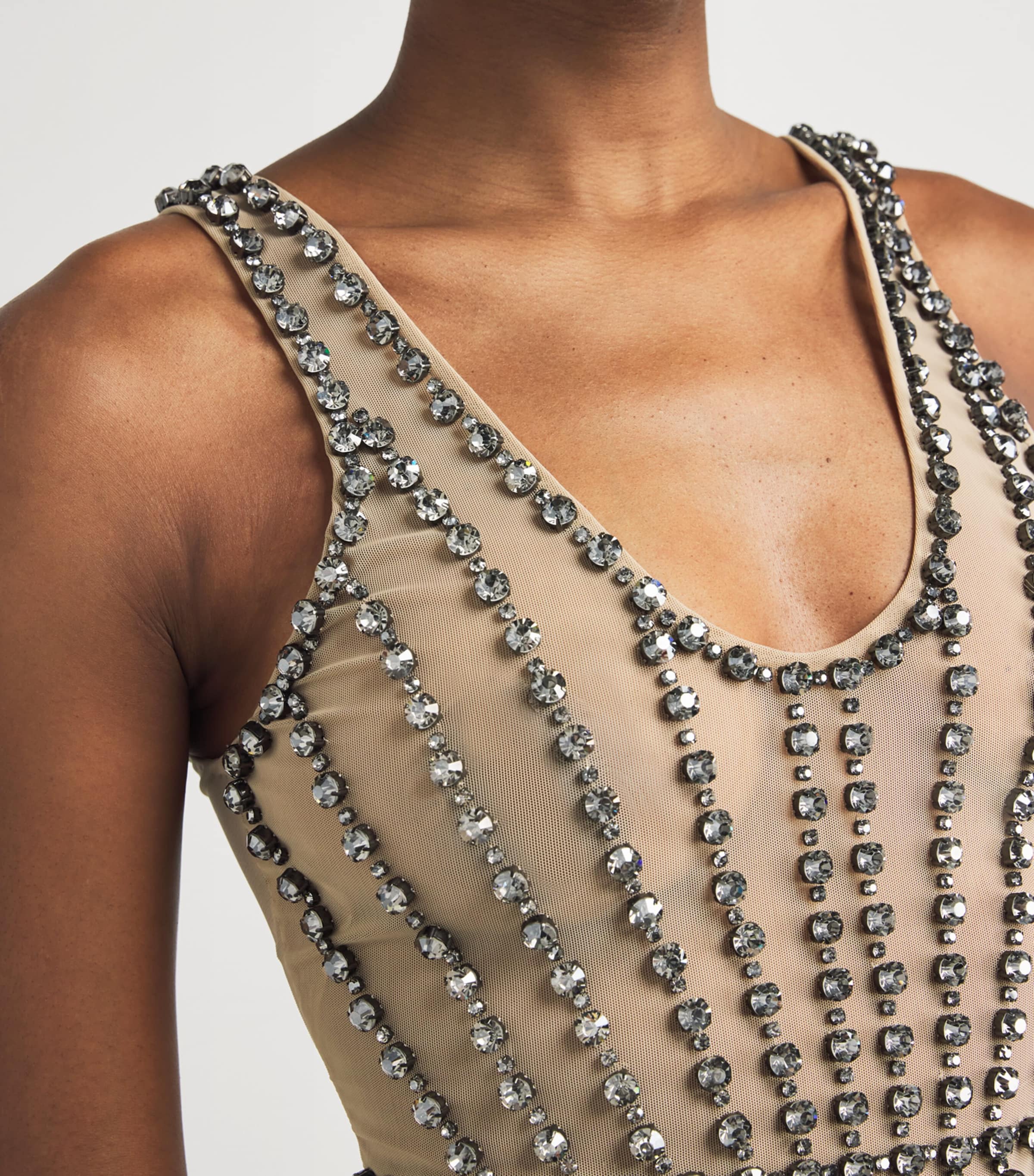 Old school glamour with a modern edge. The closing looks of Stella McCartney’s Autumn/Winter 2025 show all had one thing in common: crystals. The glittering embellishments enliven a range of silhouettes in the ready-to-wear collection too, including the mesh bodice of this sweeping satin maxi dress.