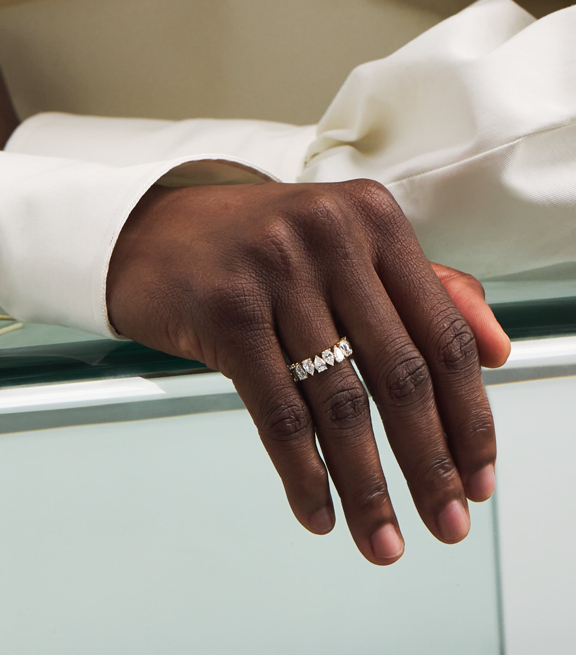 From Harrods' debut fine jewellery collection, this exquisite eternity ring showcases a row of pear-cut diamonds, symbolising everlasting elegance. Set in lustrous 18-karat yellow gold, each stone is meticulously placed to catch the light from every angle.