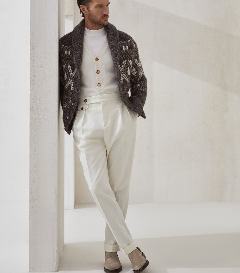 Brunello Cucinelli’s legacy in artisanal knitwear shines through in this geometric jacquard cardigan, where alpaca, virgin wool, and cashmere combine in a yarn of distinctive character. Crafted on a jacquard loom, the retro-inspired motif emerges with a subtle dusty effect, celebrating the brand’s mastery of texture and warmth. A shawl collar and metal buttons complete the relaxed, casual silhouette, reflecting Solomeo-rooted craftsmanship and decades of Italian knitwear expertise.