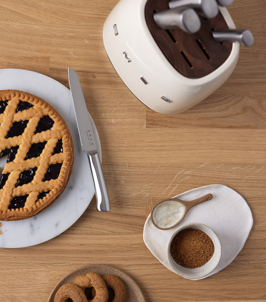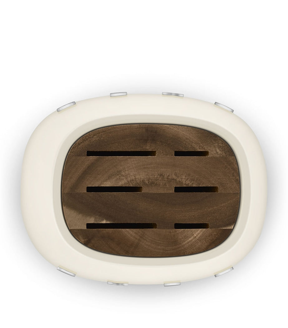 A non-slip base ensures this piece stays perfectly in place. As expected from Smeg, this knife block set also features the brand’s signature retro aesthetic. While the exterior might look similar to the classic kettle, its details are rendered from acacia wood to protect the stainless steel knives that accompany it. Each of the six knives included was designed to maximise performance while keeping safety in mind, with ergonomic handles offering a comfortable and secure grip.