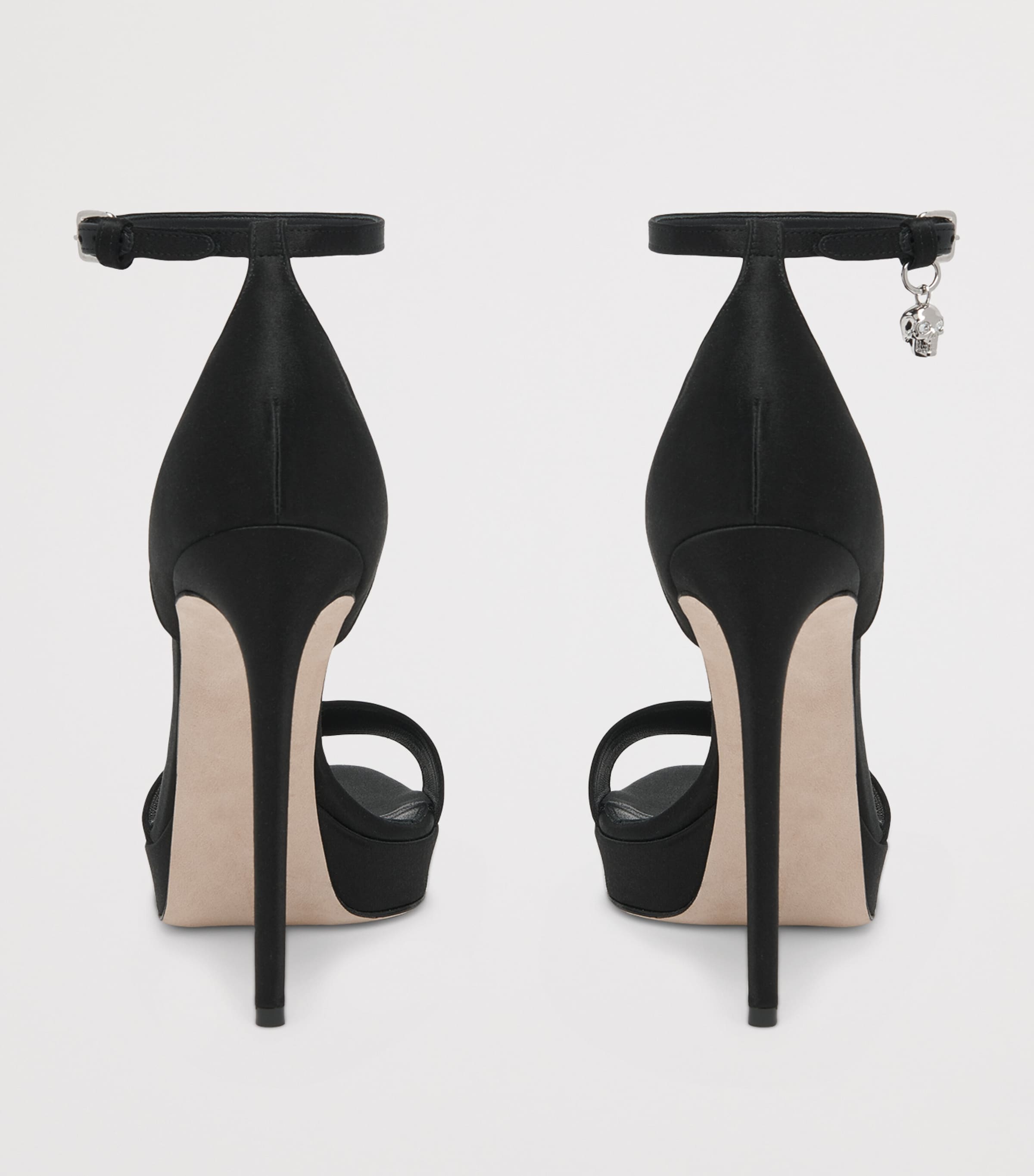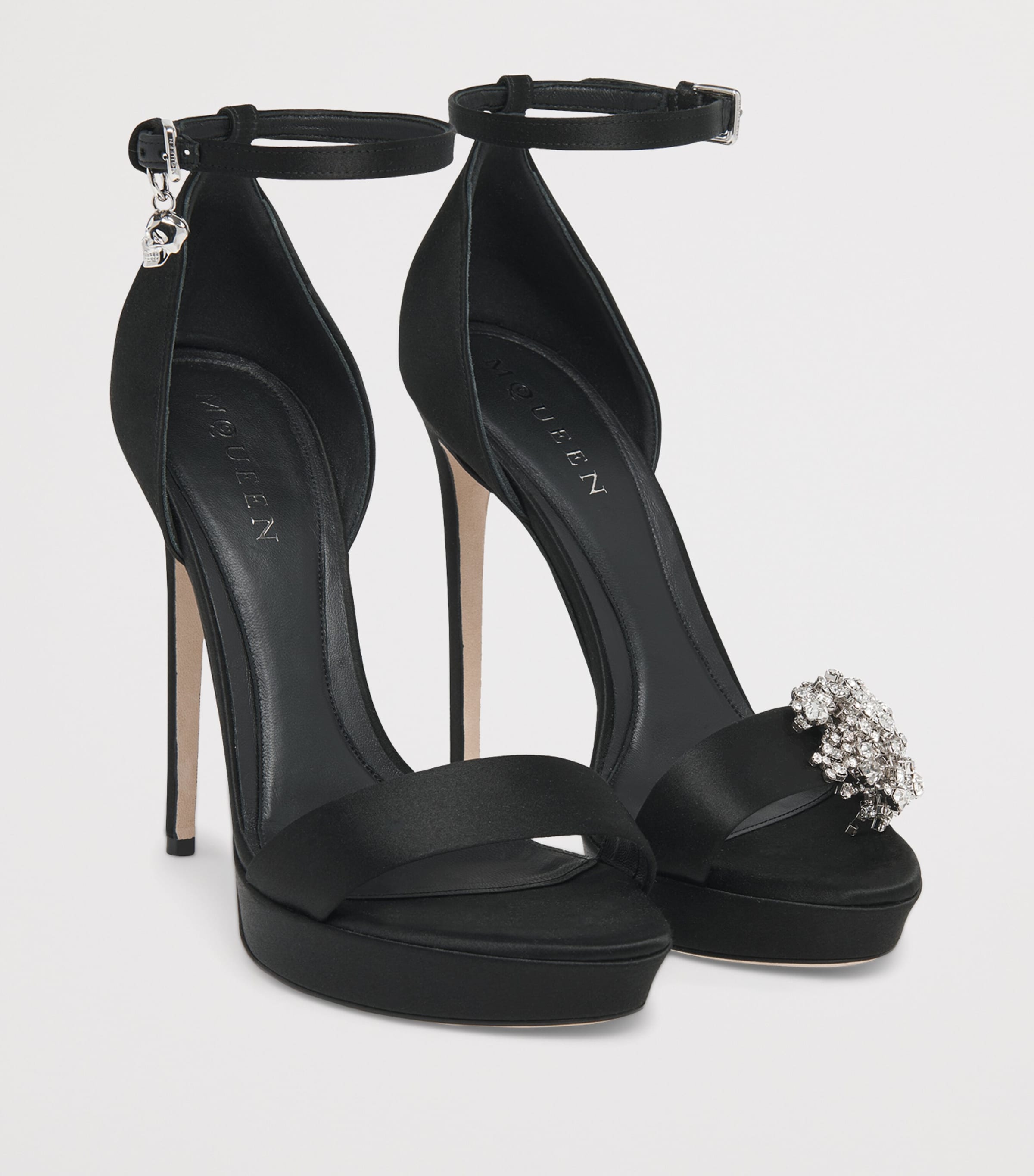 McQueen, Jewel topuklu sandaletleriyle imza niteliğindeki koyu ışıltısını gece kıyafetlerine taşıyor; burada parıldayan saten, anında tanınabilir iki motif için bir sahne oluşturuyor. Sol parmak ucunda taşlarla süslü bir broş bulunurken, sağ ayak bileği kayışından sallanan minik bir kurukafa figürü her adımda gotik bir enerji katıyor.
